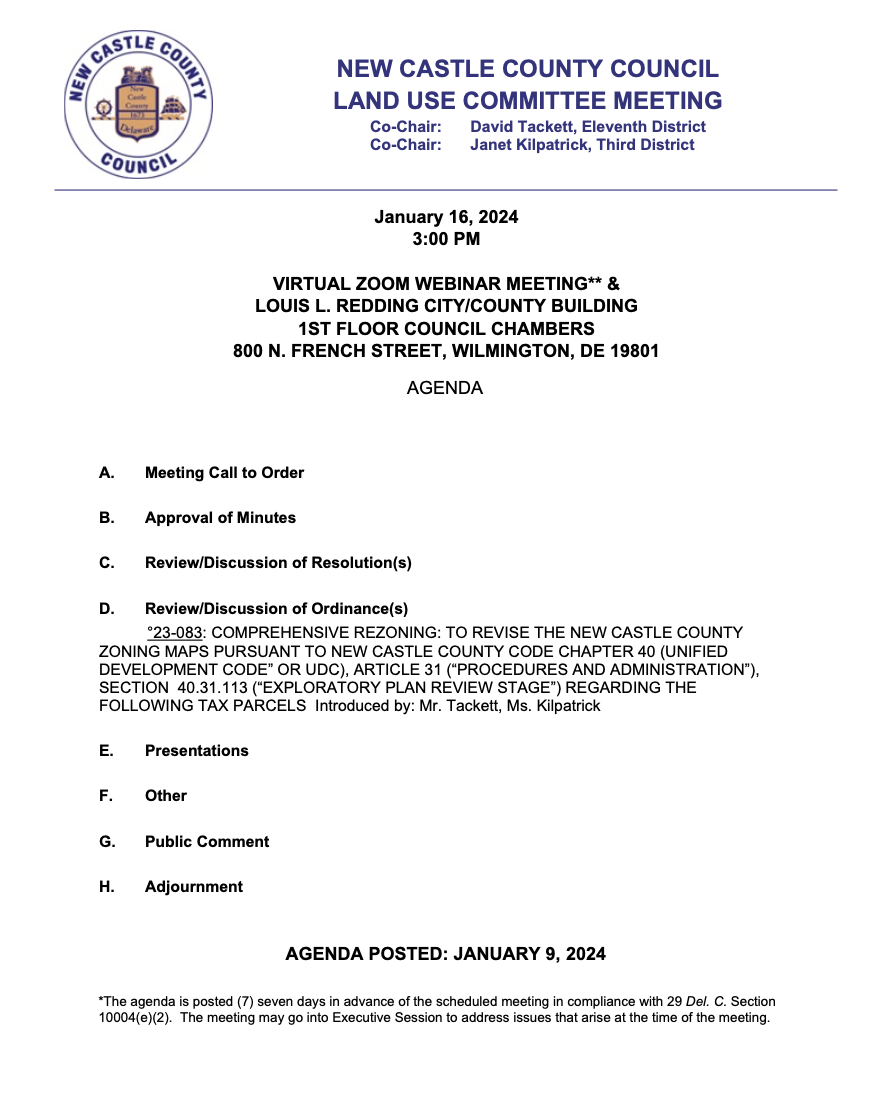 NEW CASTLE COUNTY COUNCIL LAND USE COMMITTEE MEETING January 16, 2024 3:00 PM VIRTUAL ZOOM WEBINAR MEETING** & LOUIS L. REDDING CITY/COUNTY BUILDING 1ST FLOOR COUNCIL CHAMBERS 800 N. FRENCH STREET, WILMINGTON, DE 19801 |